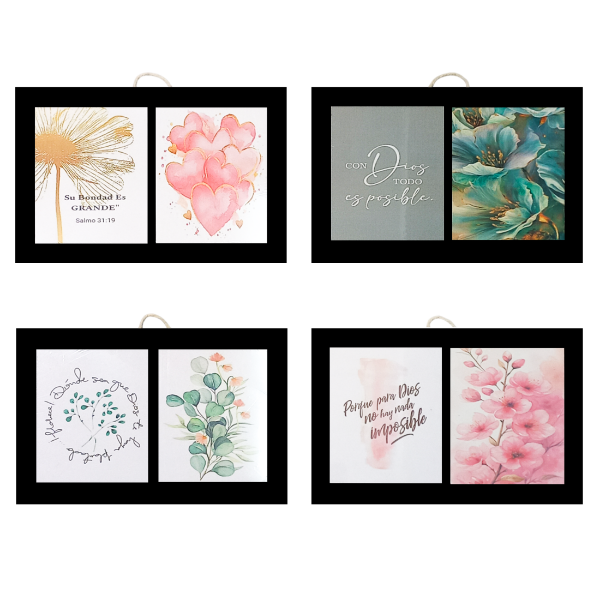 Este cuadro de madera está compuesto por dos diseños de 35 x 23 cm el cuadro, cada una con una inspiradora frase cristiana que llenará tu espacio con paz y esperanza.
